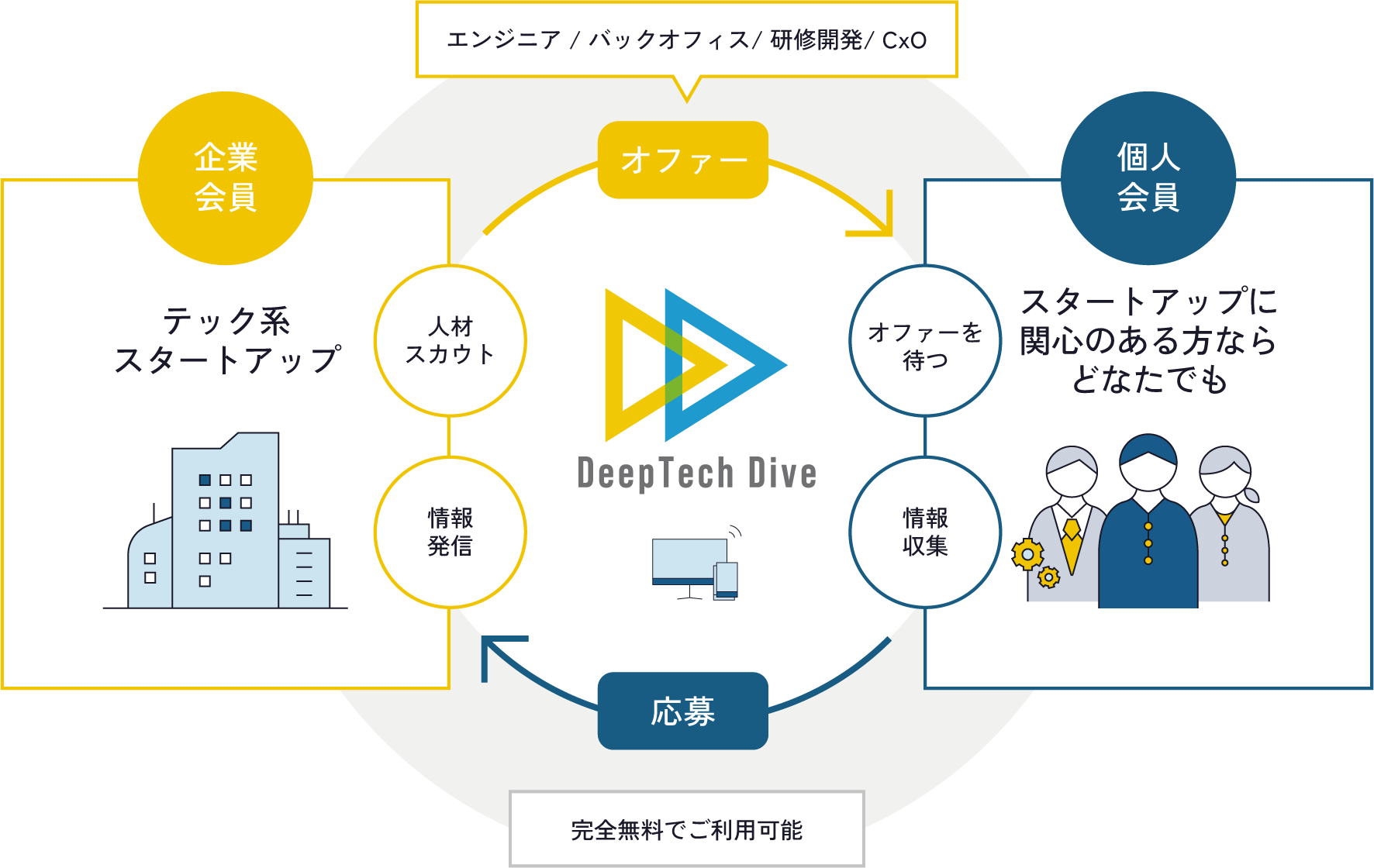 「DeepTech Dive」は、東大IPCの投資先・支援先企業を始めとしたテック系スタートアップおよびスタートアップシーズと、テック系スタートアップに関心のある社会人・学生・研究者が相互に交流できる、クローズドな人材マッチングプラットフォームです。