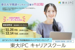 東京大学関連ベンチャーへの投資・起業支援を行う東京大学協創プラットフォーム開発株式会社(本社:東京都文京区本郷、代表取締役社長 大泉克彦、以下「東大IPC」)は、女性のための再就職支援事業を行う株式会社Waris(本社:東京都千代田区、代表取締役:米倉史夏、田中美和、河 京子、以下「Waris」)とともに、ベンチャー企業のバックオフィス業務に役立つ実践的な講座とWarisカウンセラーによるキャリアカウンセリングが一体となった就職支援プログラム「東大IPC キャリアスクール」を初開催することといたしました。