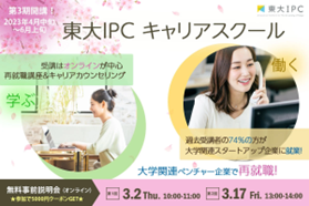 印刷する東京大学協創プラットフォーム開発株式会社(本社:東京都文京区本郷、代表取締役社長 植田浩輔、以下「東大IPC」)は、仕事に直結する学び直し(リスキリング)を支援する「キャリアシフトプラットフォーム」を通じて、すべての人の自分らしい人生を応援する人材サービス企業株式会社Waris(本社:東京都千代田区、代表取締役:米倉史夏、田中美和、河 京子、以下「Waris」)と、離職女性を対象に、東大関連スタートアップ企業への再就職を支援するリスキリングプログラム「東大IPC キャリアスクール」の第3期を2023年4月中旬~6月上旬に開催することを決定し、本日より募集を開始いたします。
