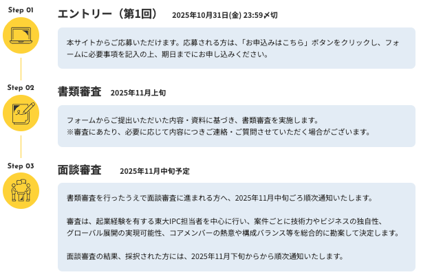 In FY2025, up to five teams will be selected. Based on the program’s outcomes, UTokyo IPC will further develop a sustainable operating model to accelerate commercialization and venture building, helping establish an environment where Japan’s world-class technologies can thrive in global markets.