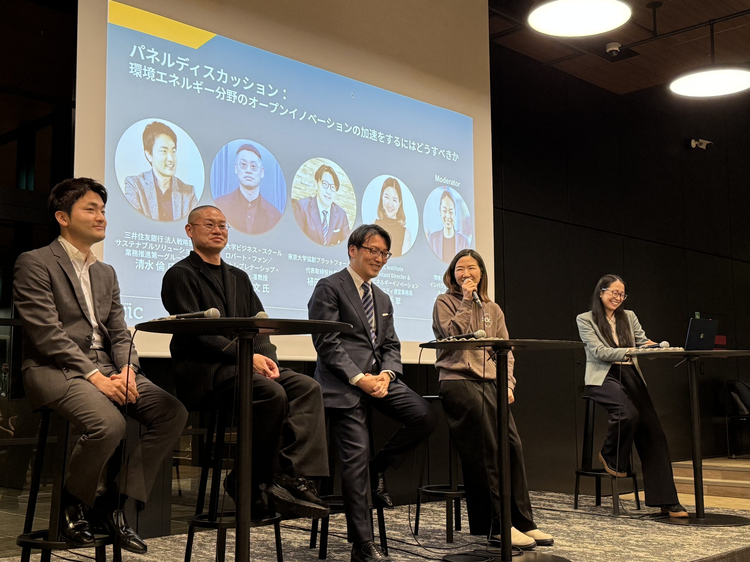 第1部では、「環境エネルギー分野のオープンイノベーションをいかに加速させるか」をテーマに、産業界・大学・エコシステム運営の立場からパネルディスカッションが行われました。