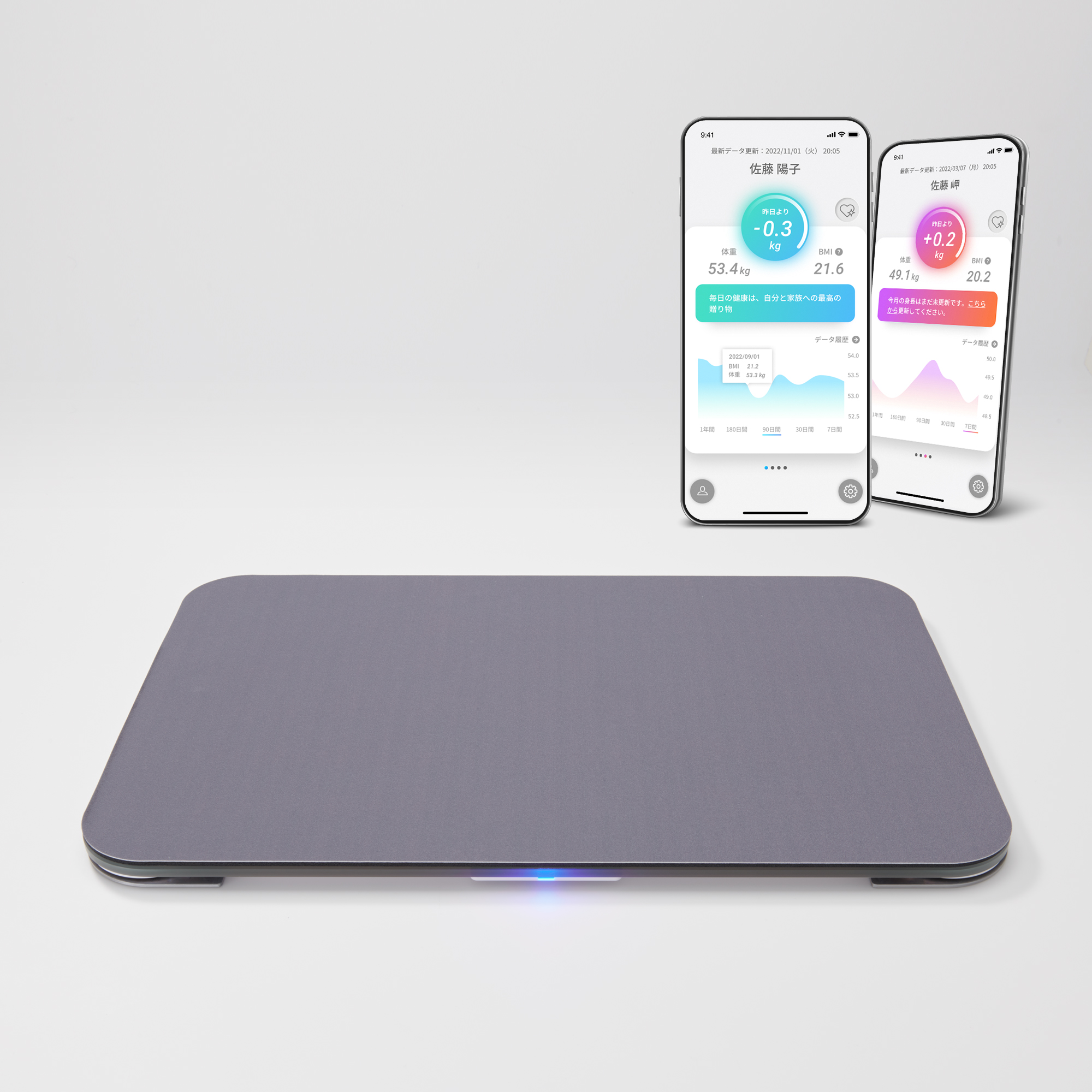 そして「家族の健康」にも留意しました。最大8名分までデータを取れ、各自のアカウントで確認できる他、離れて住む家族のデータもリモートで確認できます。その他、単に体重を記録していくだけでなく、体重変化の傾向をAIが解析し、未来の体重変化を先読みしてくれる機能により、健康意識を高めます。実際にユーザー調査によれば、約30日間の利用で平均0.8kg体重を減らせています。バスマットとしても、洗濯機で丸洗いできる珪藻土入りのソフトなもので、快適に使えるようにしています。