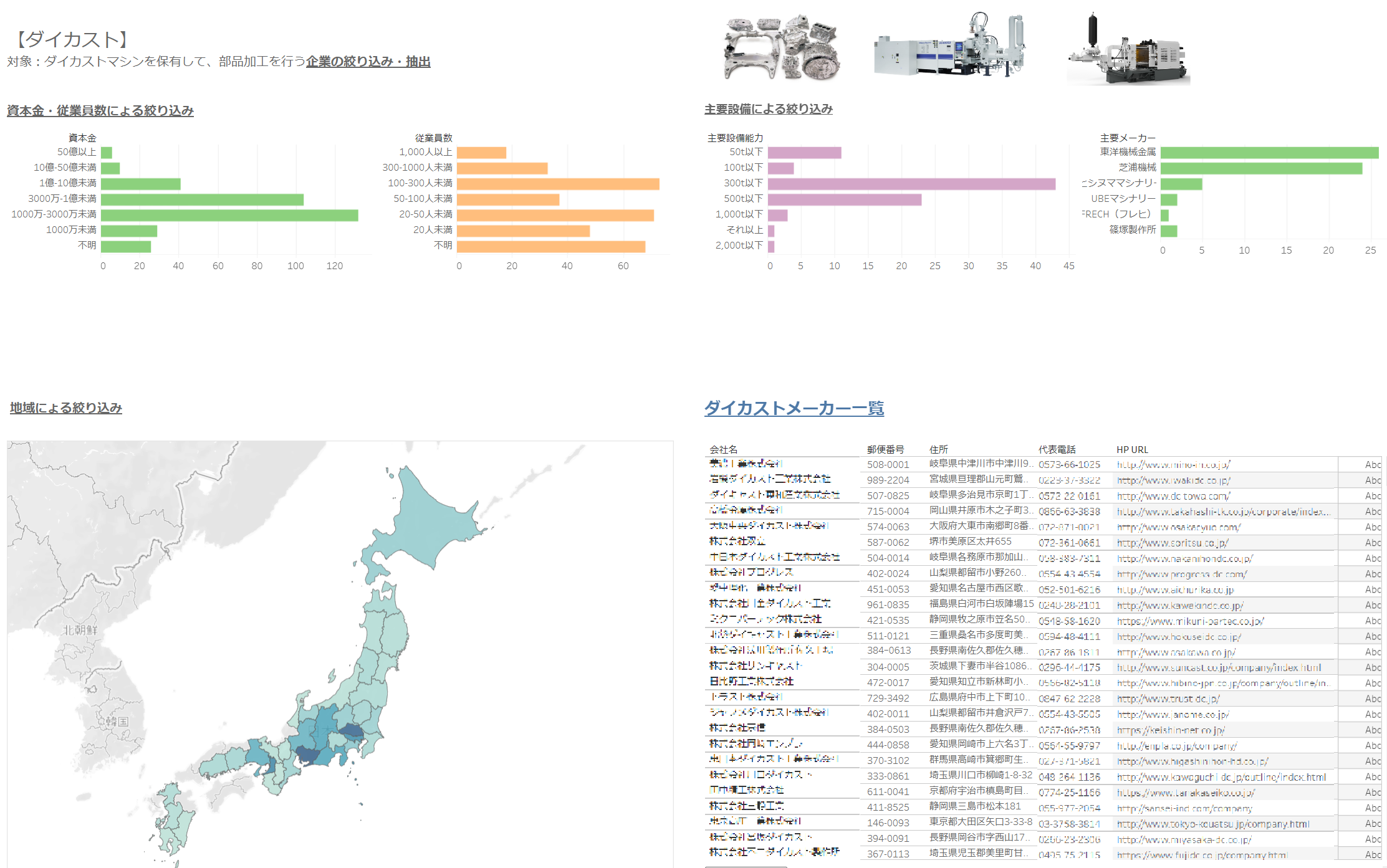 MPDは当社独自のデータベースで、中小製造業者がサイト上で公開している保有工程・設備情報を10万社分集めたものです。これにより、営業を行う際に個社ごとにどの工程の自動化が可能かを具体的に提案できます。ADSでは、実際に自働化した場合の概算費用・効果を複数パターン提示できるので、どのように自働化すれば費用対効果が高くなるかが瞬時に分かり、顧客の「分からない」との課題を解消できます。