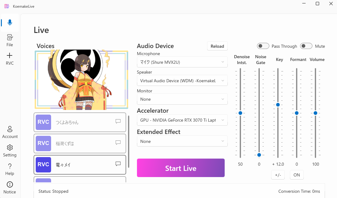 生成AIの登場により、この技術的制約を打破できる可能性が生まれました。私たちが目指したのは、その技術を誰もが直感的に使えるようにすること。その日の気分やコンテキストに応じて、自由に声を変えられる世界を実現したいと考えたんです。そこで「Koemake RVC Player」というソフトウェアを開発・提供しました。RVCとは、Retrieval-based Voice Conversionの略ですが、この先端技術を誰もが簡単に扱えるようインターフェースにこだわりました。